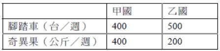 25. 下表是甲國與乙國在腳踏車與奇異果每週的生產量。根據表中資料判斷,下列敘述何者正確?
