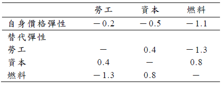 1. 若某運輸業的生產要素包含勞工、資本及燃料,以其構建出的長期成本函數計算生產要素彈性數值如下表所示。