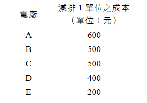1. 假設政府訂定明年必須達成境內電廠之二氧化硫(sulfur dioxides)減排20%的目標。為達此一目標,政府制定政策要求境內所有的5座電廠各減排100單位。下表為各電廠每減排1單位之成本: