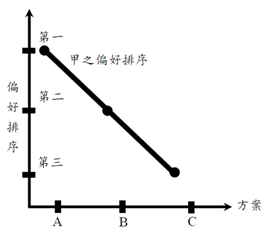 1. 假設一經濟體由甲、乙及丙所組成;甲與丙為單峰偏好(single-peaked preferences)者、乙為雙峰偏好(double-peaked preferences)者。三人將採兩兩表決法案、以多數決從A、B及C三方案中擇一執行。根據下圖座標軸線分析三人之偏好排序,