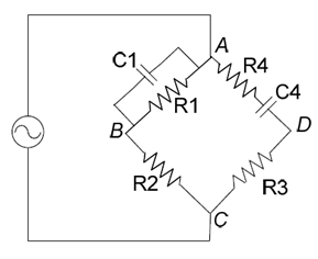 (二)求產生此交流電橋平衡時DA臂之未知電阻值R4。