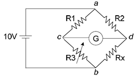 1. 如圖所示之惠斯登電橋(Wheatstone bridge)的比例臂,R1=10Ω、R2=10kΩ,標準臂R3=1~10kΩ,10V的電池(內阻可忽略)接在 a、b之間。求此電橋可測的最大電阻Rx。