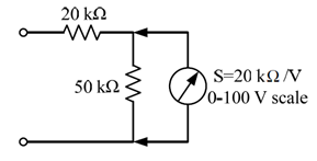 1. 一直流伏特計的靈敏度為20kΩ/V,用0-100V檔測量圖中跨於50kΩ的電壓,請計算電表指示的百分比誤差。