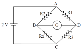 。2V的電池(內阻可忽略)接在A、C之間,檢流計G跨於B、D之間。
