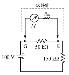 1. 如圖,某一電壓計M的靈敏度(Sensitivity)為10kΩ/V,若以檔位50V和檔位500V處,分別去量測電路的G-K兩點電壓,試求:(以下計算到小數第二位)