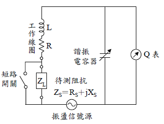 1. 下圖所示為使用Q表串聯測量法以測量未知元件特性的電路架構圖。(一)說明測量未知元件阻抗的步驟。(二)說明由測量的資料,如何分辨未知元件為電感性或電容性。(三)用數學武說明如何計算未知元件的電感值及電容值。