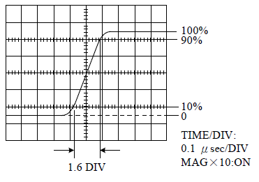 1. 用示波器來量測脈波(Pulse)的特性,將待測脈波的上升緣(Rising Edge)擴展開以方便讀取數據,如圖所示,其中橫軸已啟動10倍的擴展功能。(一)術該脈波的上升時間(Rising Time)。 (二)求該示波器的頻寬。